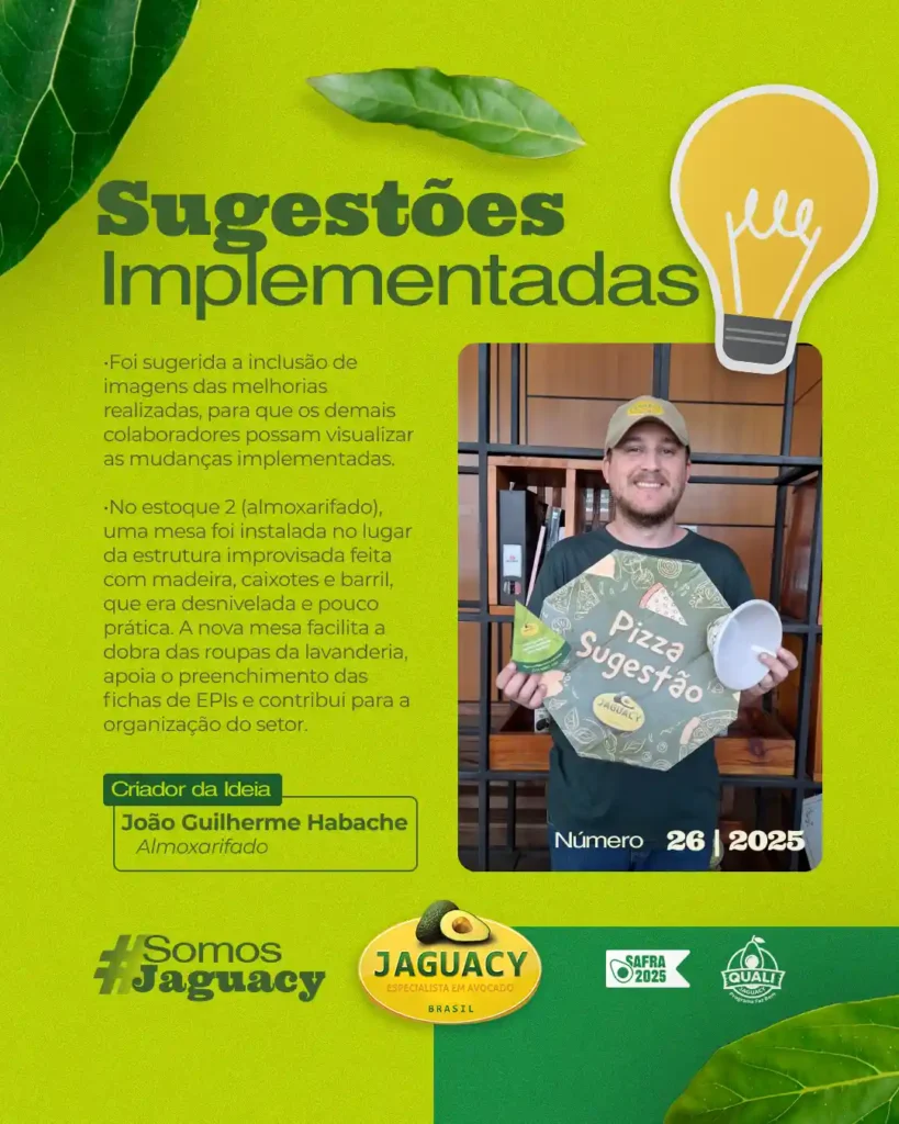Foi sugerida a inclusão de imagens das melhorias realizadas, para que os demais colaboradores possam visualizar as mudanças implementadas. No estoque 2 (almoxarifado), uma mesa foi instalada no lugar de uma estrutura improvisada feita com uma placa de madeira apoiada em caixotes e um barril, que era desnivelada, ocupava espaço e dificultava o uso. A […]