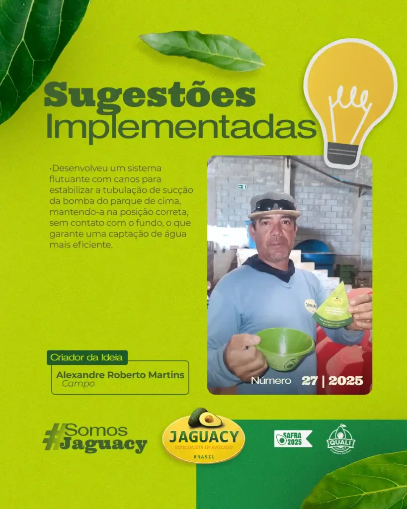 Desenvolveu um sistema flutuante com canos para estabilizar a tubulação de sucção da bomba do parque de cima, mantendo-a na posição correta, sem contato com o fundo, o que garante uma captação de água mais eficiente. 1 sugestão Alexandre Roberto de Castro Martins – Encarregado de Irrigação – Campo