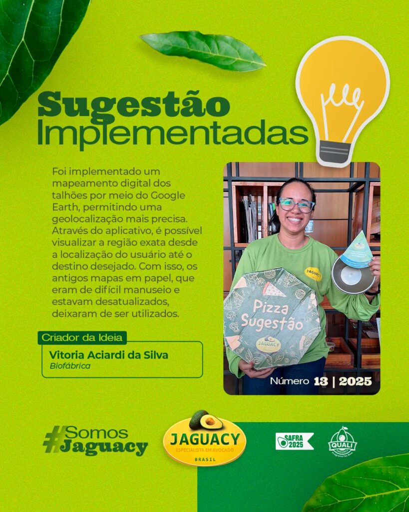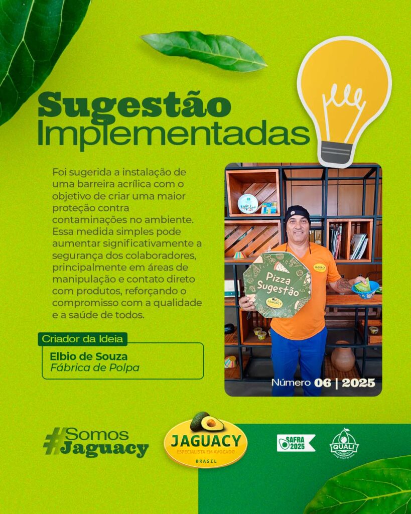 Thomas Gomes da Silva, do setor da Fábrica, sugeriu uma prática simples e eficiente para melhorar o controle de qualidade na linha de produção. 🍈 Sugestão:Ao final da esteira, a seleção manual da fruta está sendo feita com o auxílio de colheres, que são utilizadas para retirar resíduos e materiais indesejados.Essa iniciativa contribui para garantir […]