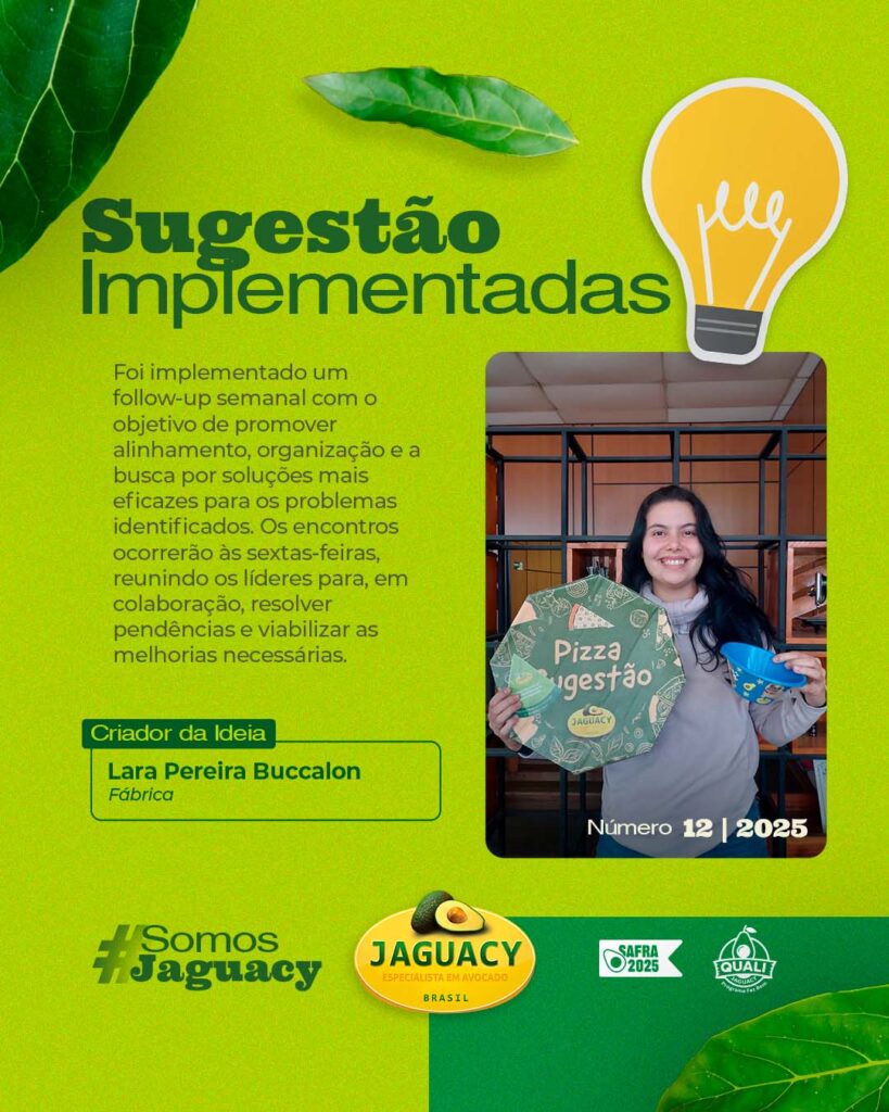 Foi implementado um follow-up semanal com o objetivo de promover alinhamento, organização e a busca por soluções mais eficazes para os problemas identificados. Os encontros ocorrerão às sextas-feiras, reunindo os líderes para, em colaboração, resolver pendências e viabilizar as melhorias necessárias Lara Pereira Buccalon – Trainee (Fábrica) – Inovação.