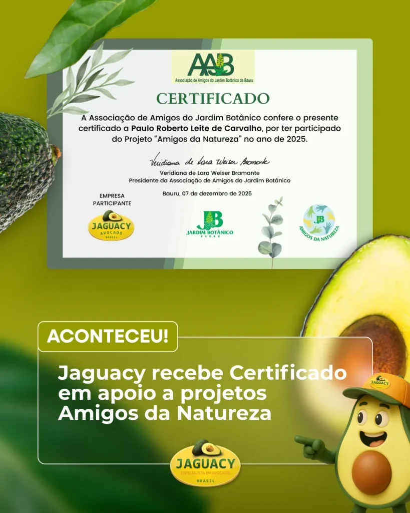 A Jaguacy recebeu o Certificado de participação no Projeto Amigos da Natureza, concedido pela Associação de Amigos do Jardim Botânico de Bauru, em reconhecimento ao apoio e compromisso com iniciativas que promovem a preservação ambiental e o cuidado com a natureza.