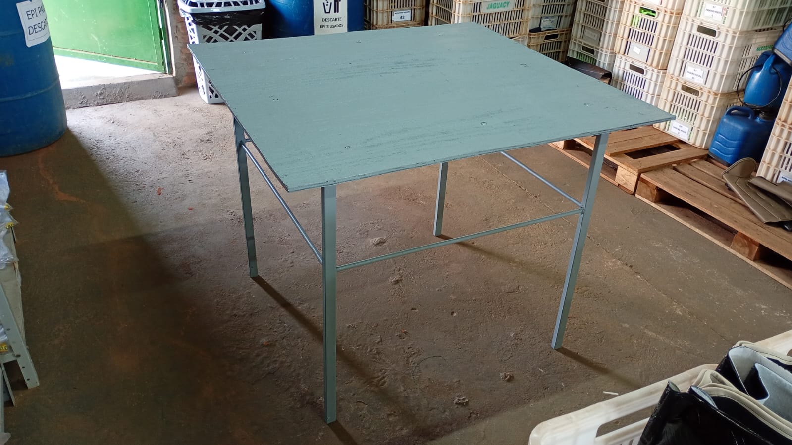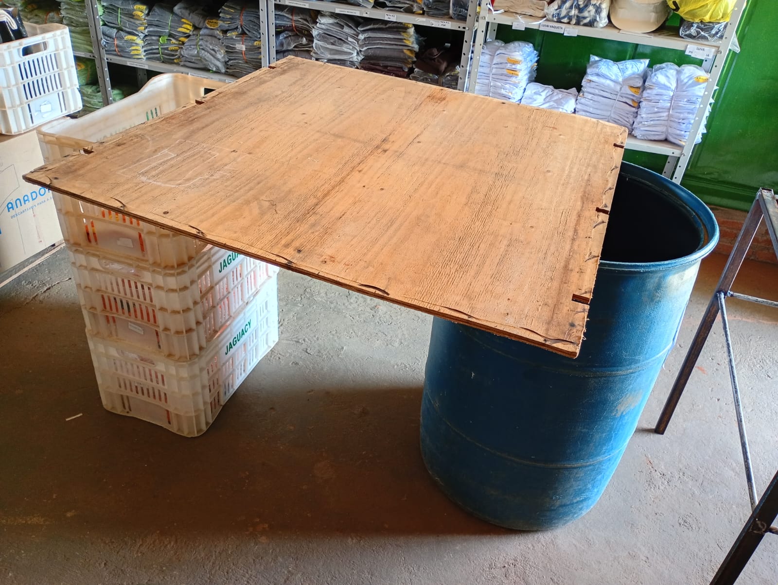 No estoque 2 (almoxarifado), uma mesa foi instalada no lugar de uma estrutura improvisada feita com uma placa de madeira apoiada em caixotes e um barril, que era desnivelada, ocupava espaço e dificultava o uso. A nova mesa facilita a dobra das roupas vindas da lavanderia e serve como apoio para atividades diárias, como o preenchimento das fichas de EPIs pelos colaboradores, contribuindo para uma melhor organização do setor.